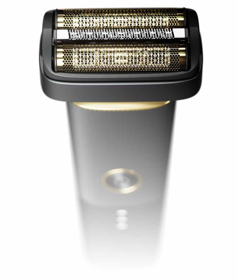 Dual independent foils with etched cutting blade design and integrated long hair trimmer cutting element.