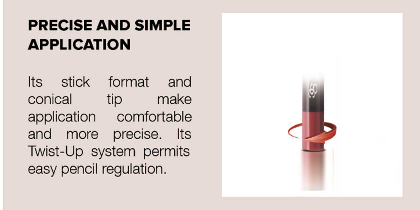 Pencil format allows easy and precise application for perfectly defined lips. Twist-Up system makes it easy to dispense the pencil.