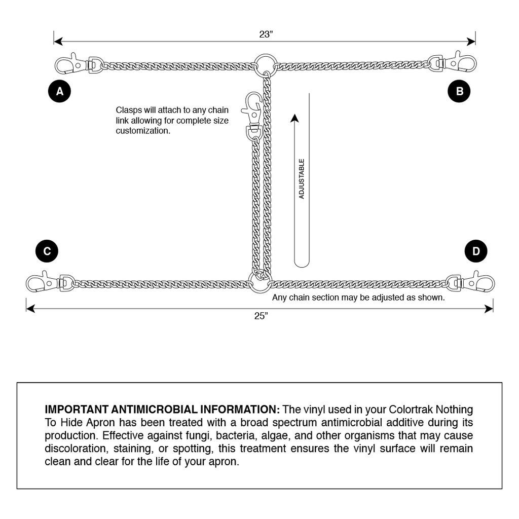 The Nothing to Hide Apron is designed to prevent stains with style! The apron also features adjustable chains that fit various body types and easy-to-clean antimicrobial material.