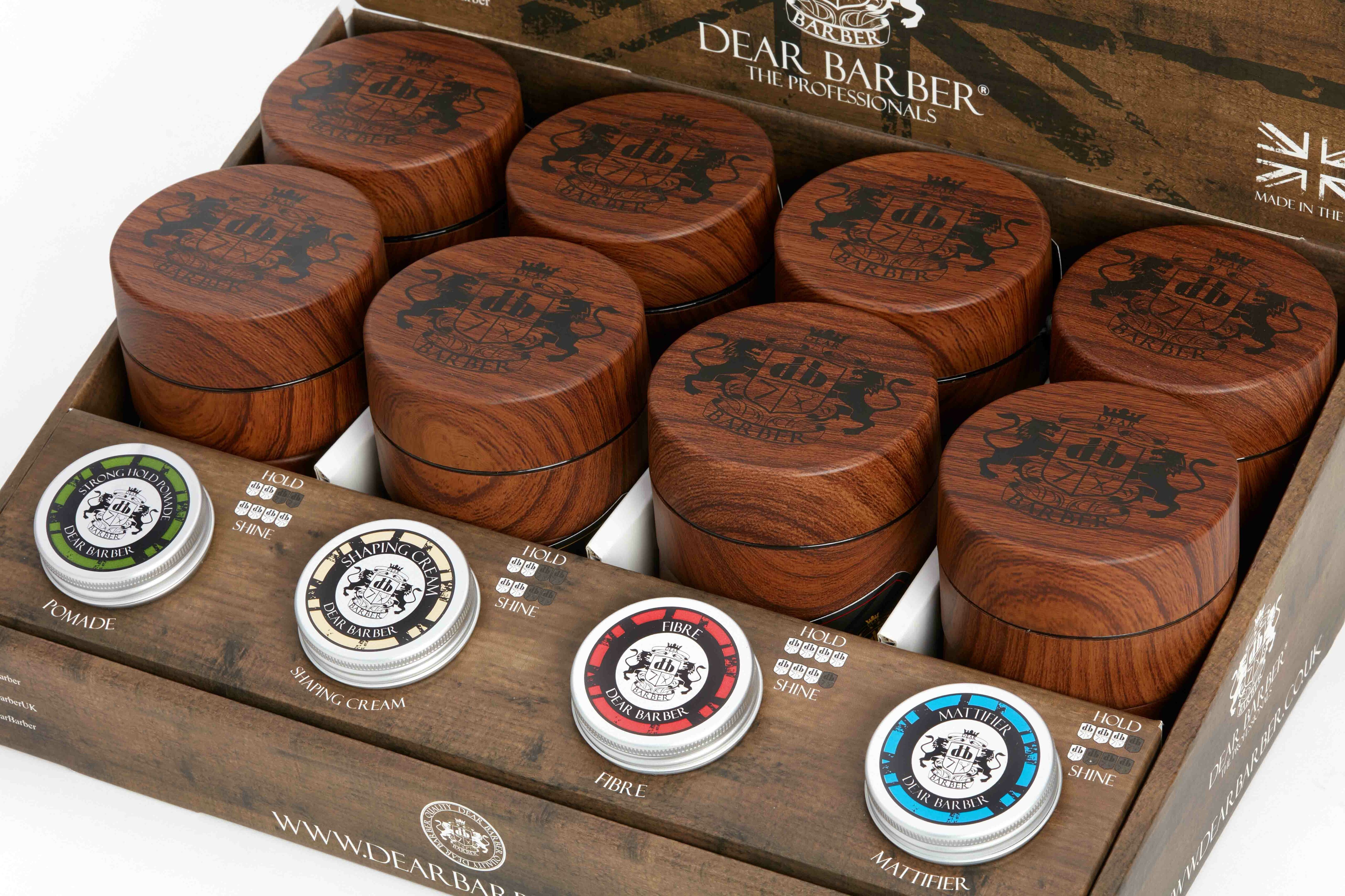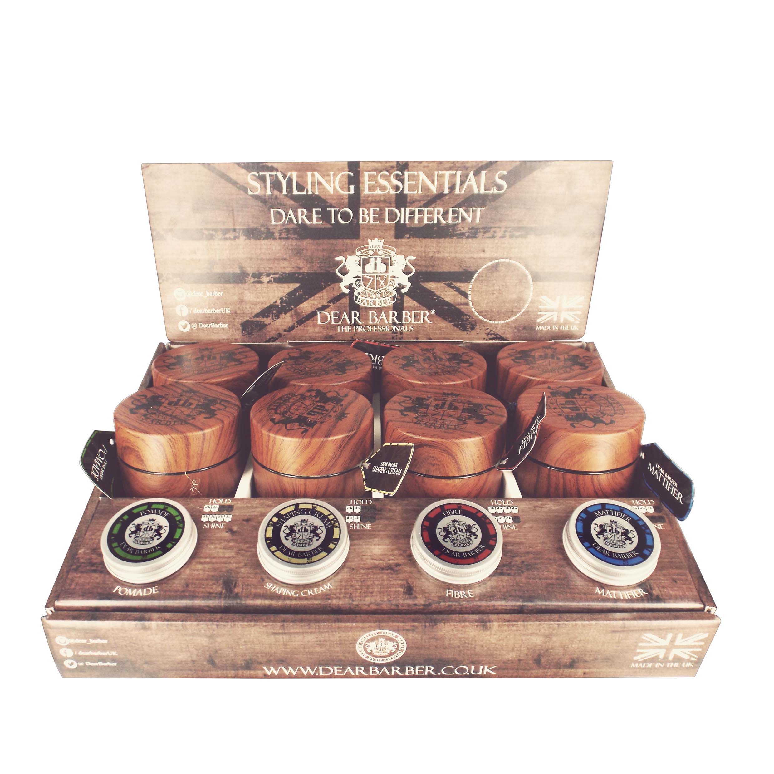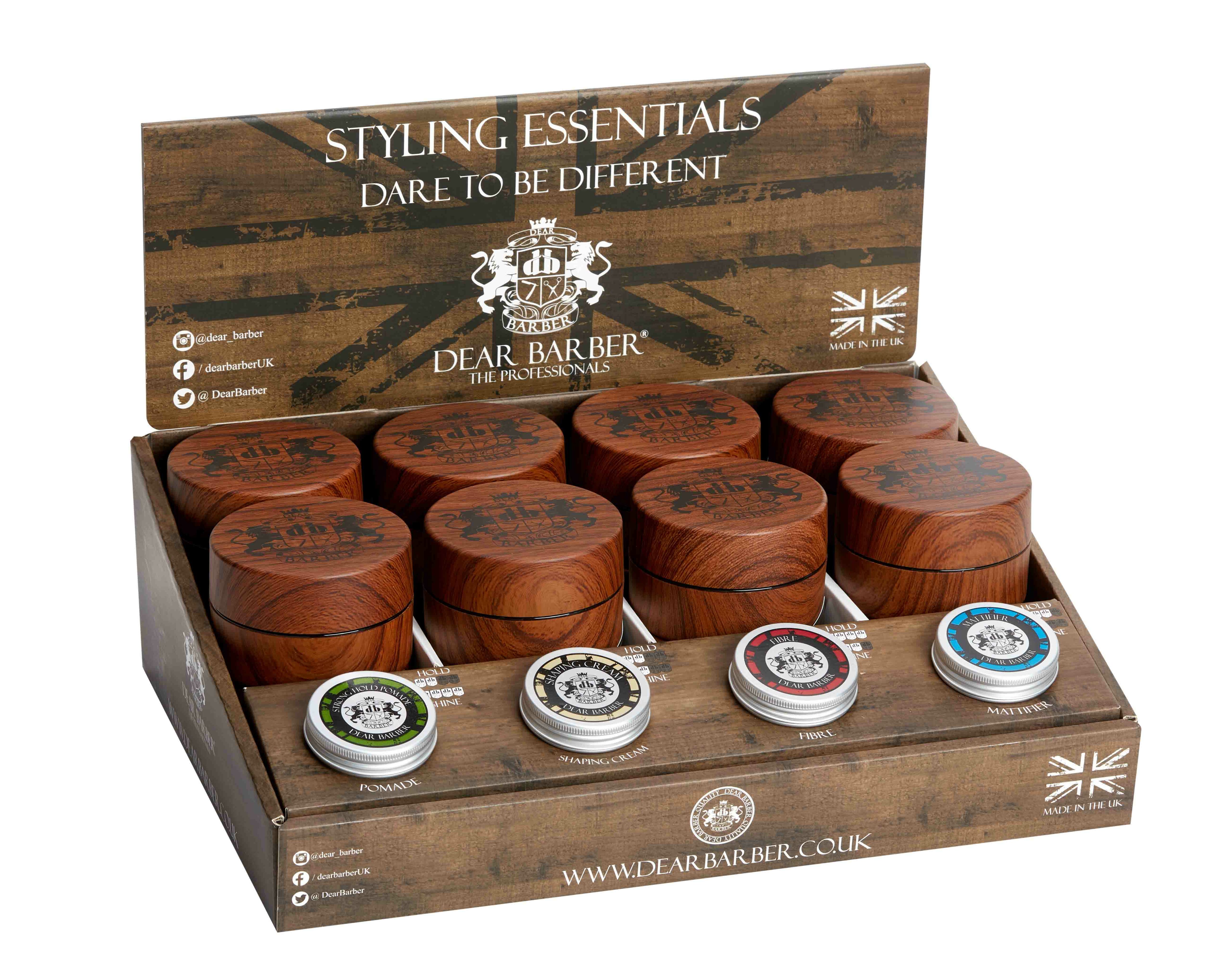 The Dear Barber filled Styling Counter Top Display is an eye-catching point-of-sale item, perfect for containing the essential range of Dear Barber Styling products.