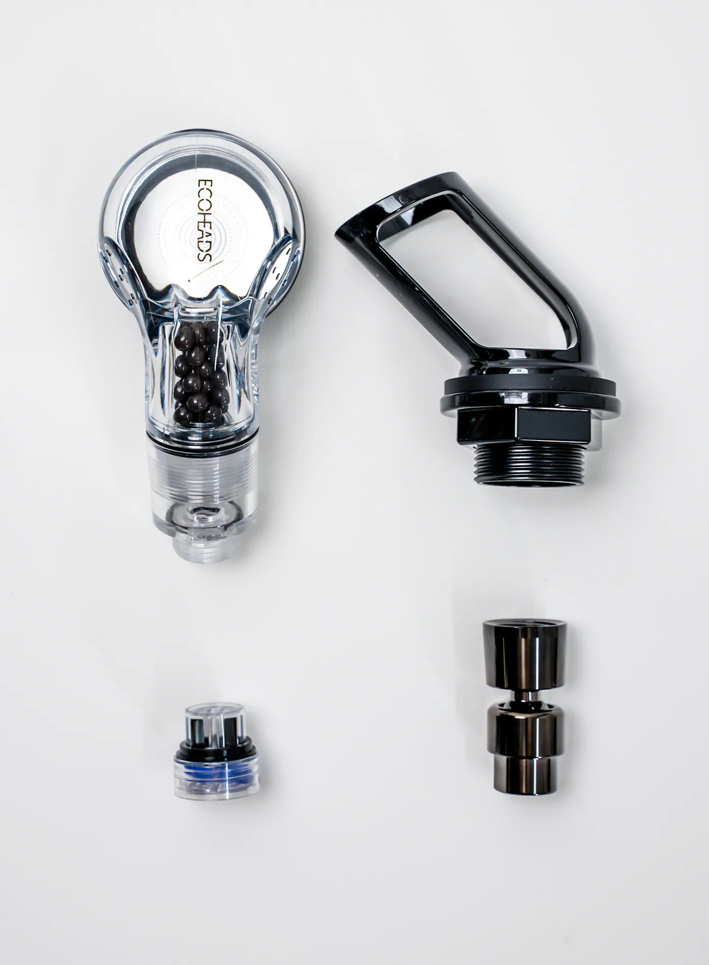 Discover the innovation of our latest magnetic filter, thoughtfully combined with the naturally sourced anti-bacterial stones like Magnetite and Red Clay Ceramic, as well as other powerful minerals. This unique filtration system diminishes lime-scale and chlorine, while simultaneously enhancing negative ion production to replenish moisture and revitalizing ions for dry, frizzy, and damaged hair.
