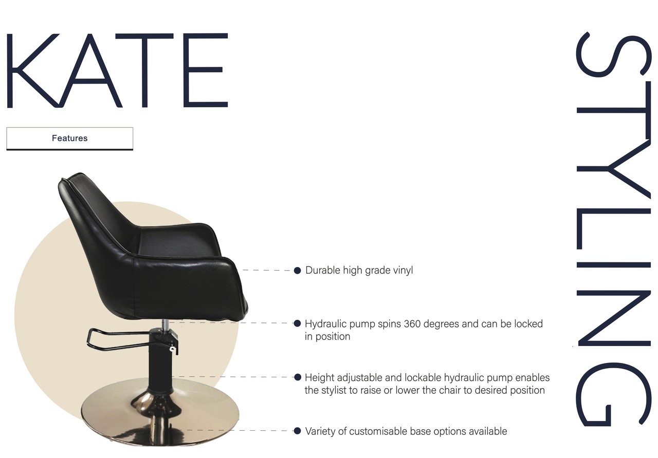 The Kate Styling Chair is simple and yet stylish, whilst maintaining comfort for the clients to relax back and enjoy their service.
