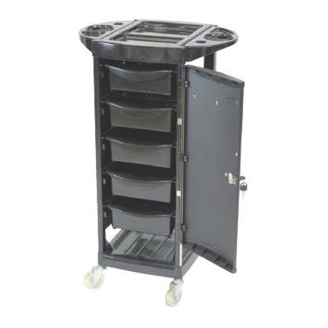 5 Drawers Lockable door with handle side accessory holders collapsed side holder wings sturdy solid frame detachable heat resistant tray easy rolling wheels bottom flat tray dryer/clipper holder hook stylist name card holder.