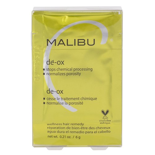 Stop oxidation of bleach and developer. Malibu C De-Ox is a unique backbar product designed to normalize porosity and pH. Cost-efficient and 100% vegan, De-Ox is simply mixed with water then applied to hair after colouring, lightening or toning to stop oxidation. De-Ox sits in the hair for only 60 seconds before rinsing, delivering your client the best service and results possible. De-Ox ensures maximum bang for your buck – the sachet, once mixed with water, forms a light gel and spreads easily throughout hair. 12 sachets equal almost 3 litres of product once mixed with water.