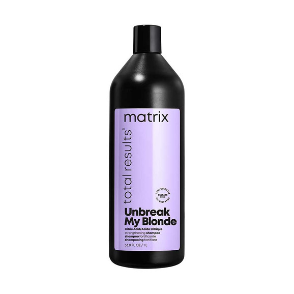 Matrix Total Results Unbreak My Blonde Shampoo is infused with citric acid to gently cleanse sensitive hair. Revives damaged and over-processed hair, leaving hair soft, shiny and 3x stronger!*