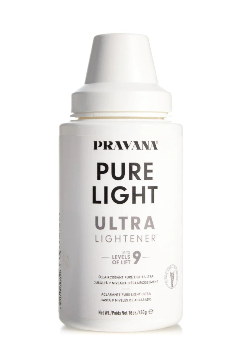 In a non-metallic bowl, mix 1 part PURE LIGHT Ultra Lightener with 2 parts PRAVANA Creme Developer, Zero Lift-40 Volume (1:2). For on-scalp application, use up to 20 volume; for off-scalp, use up to 40 volume. Apply to dry hair. Process for up to 55 minutes. Rinse thoroughly after processing then shampoo and condition with desired care products.