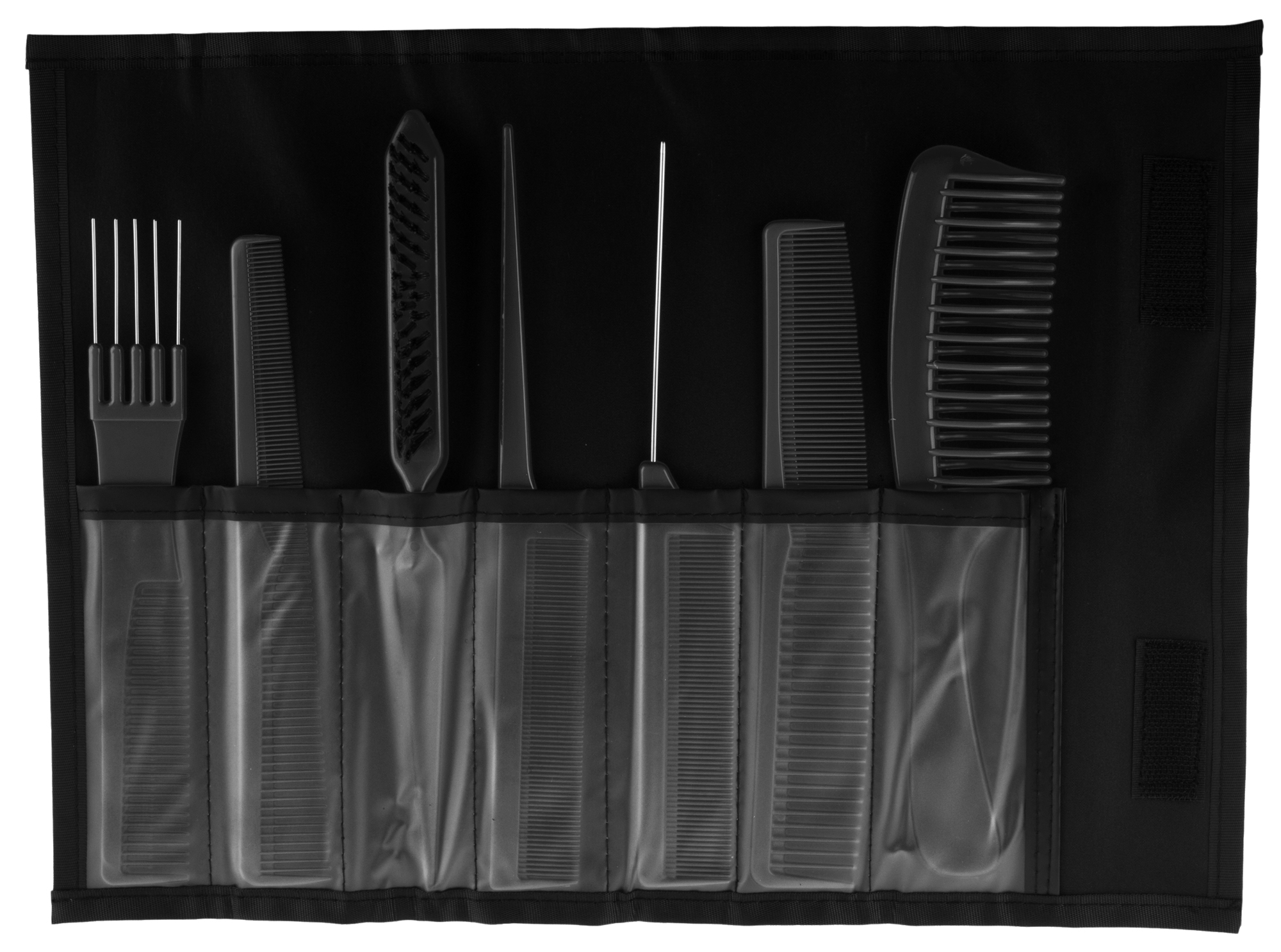 An assortment of styling tools displayed in a convenient black pouch, perfect for travel and storage. Salon Smart Folding Comb Set folds open to unveil a set of seven tools, including a styling/cutting comb, sectioning comb, plastic comb for colouring, lifting comb, teasing brush and detangling comb.